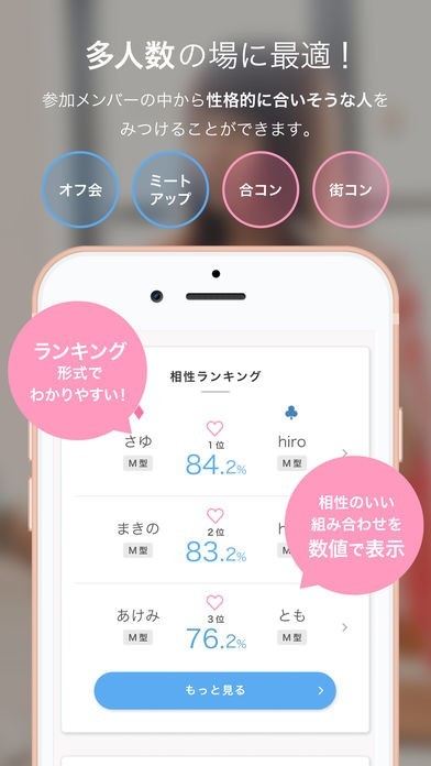 オフ会、ミートアップ、合コン、街コンなどの多人数が集まる場で本サービスを利用することで参加メンバーがより効率的に性格的に合いそうな人をみつけることが可能です。