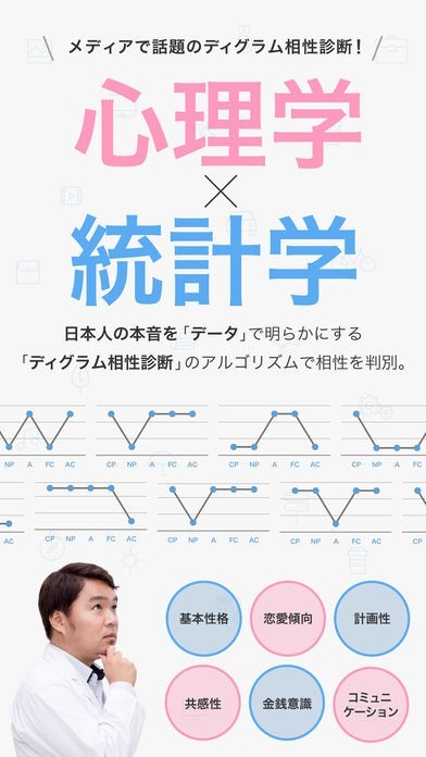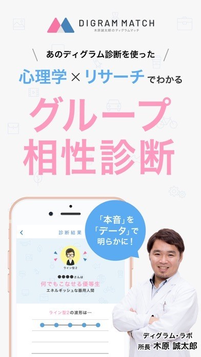 心理学+リサーチからわかるグループ相性診断アプリ【木原誠太郎のディグラムマッチ】は、初めてあった人と人がお互いの性格を理解し、親交を深めるきっかけを提供します。