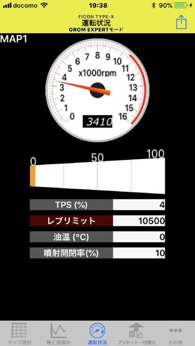 このアプリは無料でダウンロードできます。無料の時はすべてのFI-CON TYPE-Xと接続することができますが、タコメータ画面のみしか表示されません。(タコメータとTPSのみ表示)。