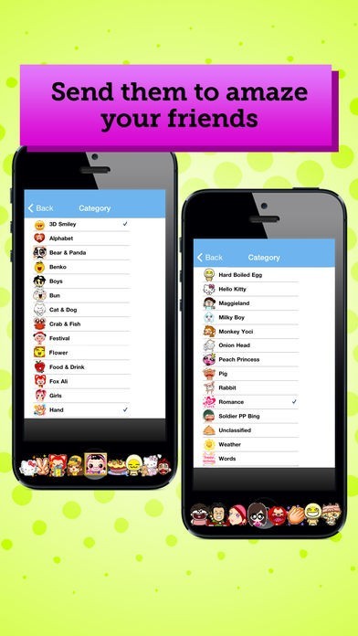 複数のアニメーション絵文字が収録されていて、LINE等のSNSに送信出来るのが楽しいです。食べ物や花等のカテゴリー別に表示出来る仕組みも良いです。