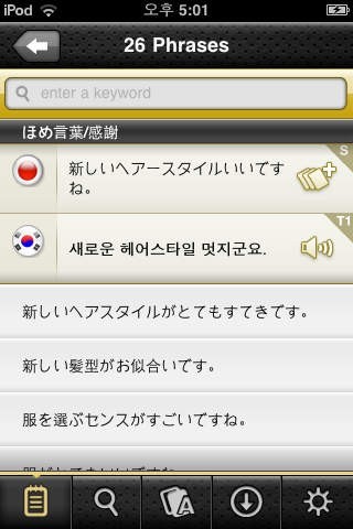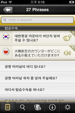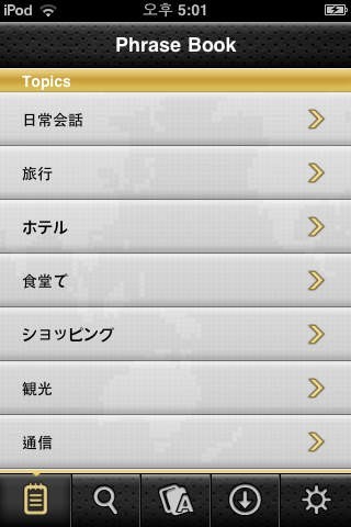 「DioDict 会話辞書 (英語/韓国語/中国語/日本語) with Sound」では、海外旅行における必要不可欠な会話術を学習できるアプリです。なかなか覚えられない単語や旅行の時に必要な単語だなと感じた場合はリストインしておく事でメニュー画面からいつでも呼び起こすことが可能です。また、日常会話や挨拶、ショッピングの際に必要な言葉がカテゴリごとに分けられているので必要に応じて学習出来るのです。単語を調べれば音声を聴けるのでよりネイティヴな発音を学べます。