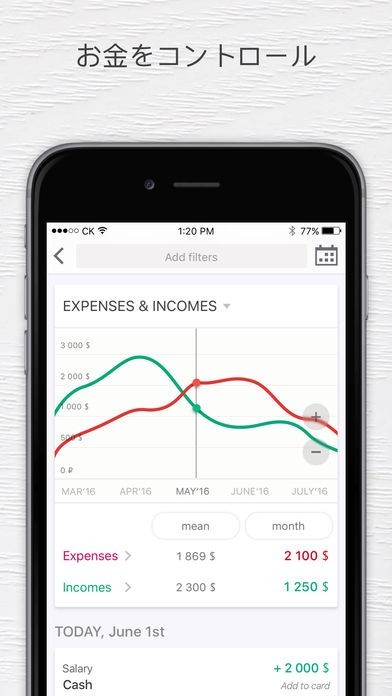 アプリを見れば、収入と支出のバランスがすぐに分かります。収入ラインと支出ラインが表示されるグラフを見れば、バランスの変化を知ることができます。家計管理で重要になる収支を知って、お金のコントロールをしましょう。