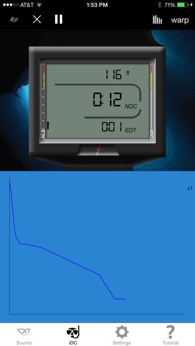 This App runs - in real time - our implementation of the Buhlmann ZH-L16C algorithm (moderate conservatism setting) and supports the most typical dive screens such as: surface, normal diving, entering deco, deco stop, deco violation, fast ascent alarm and post dive.