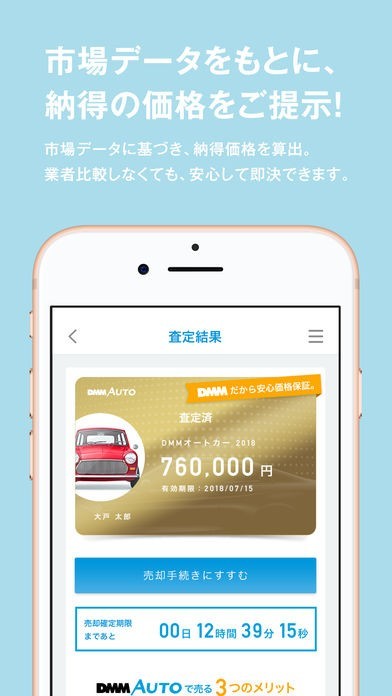 リアルタイムに変動する市場データに基づき、納得いただける最大限の価格を算出。業者比較しなくても、安心して即決できます。DMM AUTOだからできる、査定金額の安心保証!