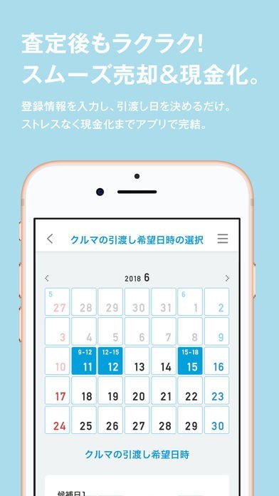 査定金額に納得いただけたら、登録情報を入力して引き渡し日を決めるだけ。ストレスなく現金化までアプリで完結できます。