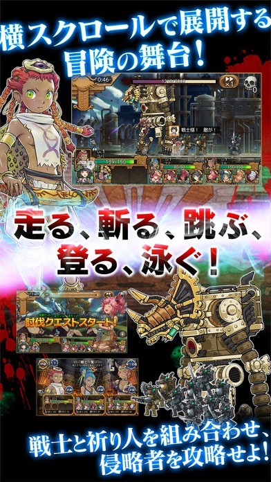 走る、跳ぶ、斬る、泳ぐ、登る! あなたの分身である戦士キャラクターは多彩なアクションでステージを駆け巡り、侵略者に奪われた大地を取り戻すために戦います。戦士の職業は7種類。特徴の異なる3人の戦士を部隊に編成し、異国からやってきた侵略者軍団を一掃するために出撃します。