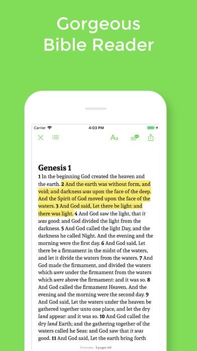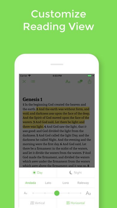 With powerful reader, Bible All Versions support you read day & night easily, adjust font, highlight & bookmark your bible.