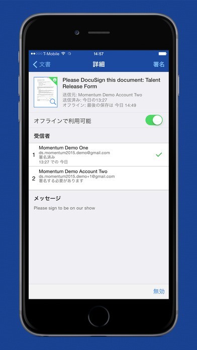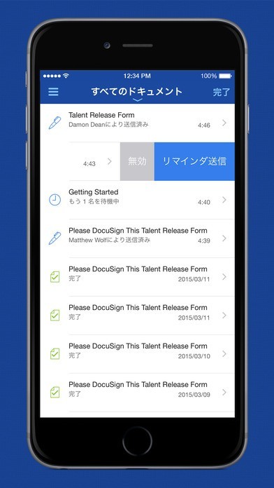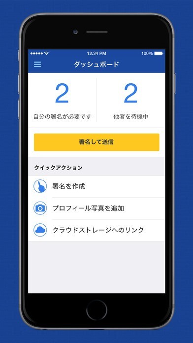 「DocuSign」は申請書や契約書などの重要書類をスマートフォンで安全にやり取りすることができるようになるアプリとなっています。秘密保持契約書やリース契約書などの署名が必要な文書を送信することもできるようになっていて、米国連邦電子署名法に基づいて監査証跡において署名者の名前や署名した日時や場所が記録されるようになっているのでしっかりと記録を残して署名を行うことが出来ます。文書はクラウドストレージサービスを利用してやり取りを行いますが、オフラインアクセス機能も搭載しているのでインターネット環境がない状態でも文書を確認、署名することが出来ます。