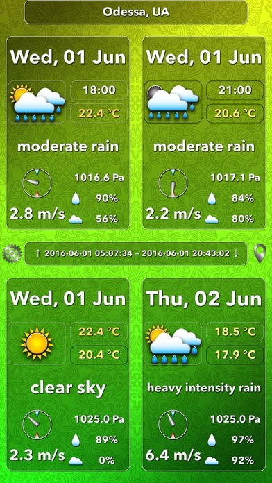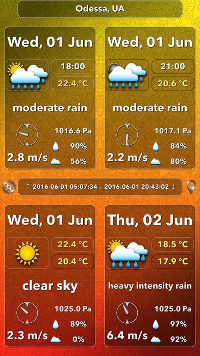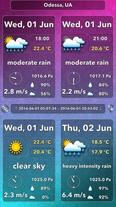 ● The most informative weather information (date, time, weather image that refines the description of weather, temperature, barometric pressure, relative air humidity, cloudiness, wind speed, wind direction, sunrise, sunset);
