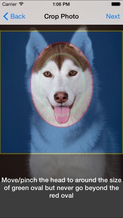 5) Zoom/Pan your head to fit into the oval on the screen, make sure the size of the head never exceeds the oval. Touch "Next".