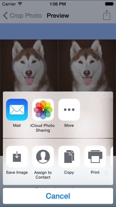 7) Now you can preview the passport photo that is about to be generated. You can zoom/pan the picture to look into more details. If you are happy at it, touch "Share" at the top right corner. Then you will be offered various of options to share the photo including uploading to social network or saving to your iOS photo album.