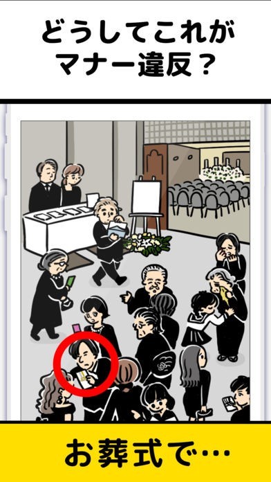 「㊙ドン引きマナー講座」は、冠婚葬祭などのフォーマルな場面でのマナーについて、イラスト形式で問題化されており、クイズ感覚で楽しみながら覚えられるアプリです。 問題は全部で60問収録されています。全ての問題が解ける頃には、あなたは一流の大人に近づいていること間違いなしです。 失敗の許されない場面でも確実に対応できるマナー知識を覚えましょう。