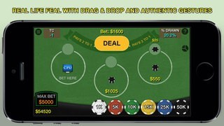 * Fluid animation, lots of sound effects including an interactive dealer, and finger gestures mimicking real life casino hand motions.
