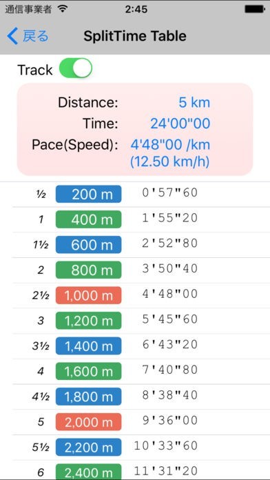 距離が800m(0.8km)/1000m(1km)/1500m(1.5km)/2000m(2km)/5000m(5km)/10000m(10km) km の時は、1kmごとではなくトラックの距離を基にしたスプリットタイム表を表示できるようになりました。