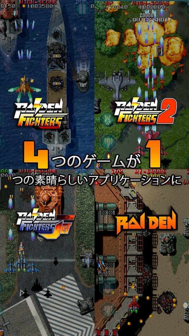 App Storeより引用ライデン レガシー、超人気のライデンシリーズの4作が1つにまとまった!ライデン、ライデンファイターズ、ライデンファイターズ 2そしてライデンファイターズ JETの4作品。オリジナルの開発はセイブ開発。この屈指の名作スクロールゲームは、単に携帯用に忠実に再現されただけでなく、最新 機能搭載でパワーアップ!