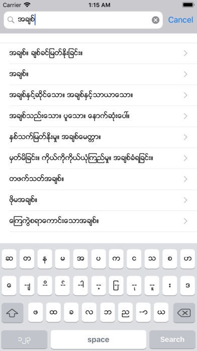 アプリオリジナルの専用キーボードを使って、実際に文字を打って検索することが出来るのが特徴です。他のアプリには無いビルマ語のキーボードを使って、ライティング能力を高める事が出来ます。