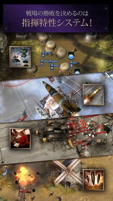 司令官の戦略スタイルに合わせて、指揮特性を選択し、様々な兵力を集めて最強の部隊を構成してください。リアルに再現された躍動的な戦場で、迫ってくる敵軍を退け、敵の司令部と掩体壕を破壊し、勲章と栄えある勝利を勝ち取りましょう!