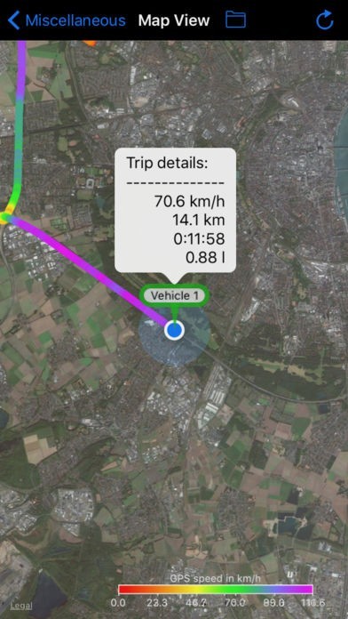 • Follow your current trip with a colored track, showing your GPS speed