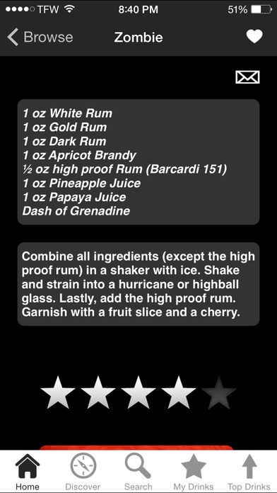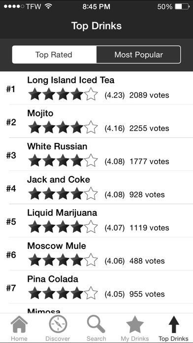 部分名検索機能が搭載されているため、分かっている情報のキーワードからカクテルを検索することができます。また、ユーザー評価によるランキングから人気のカクテルも一目でチェックすることができます。