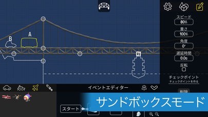 サンドボックス機能を搭載しています。複数のパーツを組み合わせることで、好みの橋を作成可能。アイディア次第で他にはないユニークな橋を作り上げることができるでしょう。また、サンドボックスではステージの作成も行えます。