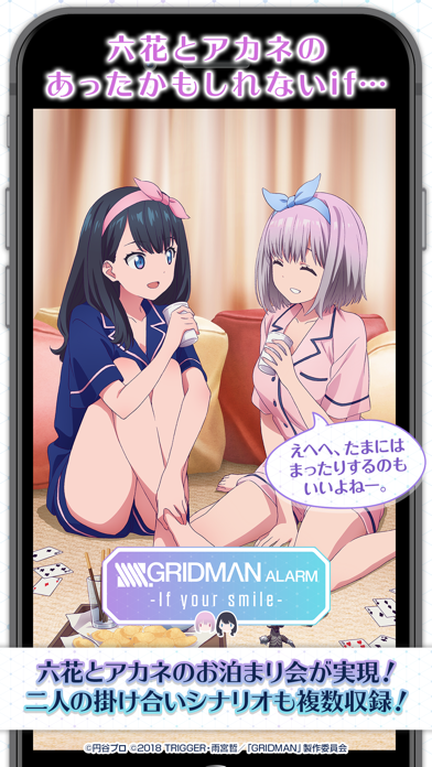 App Storeより引用2018年10月に放送され、一世を風靡した大人気アニメ「SSSS.GRIDMAN(グリッドマン)」に登場する二人のヒロイン「宝多六花」(CV:宮本侑芽)と「新条アカネ」(CV:上田麗奈)のアラームアプリが登場!