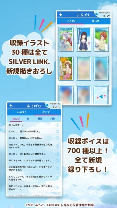 有名なフレーズ「にゃんぱす〜」のボイスを聞けるだけでなく、SILVER LINK.書き下ろしの、アプリ限定のアニメイラストが30種類すべて、みることができます。