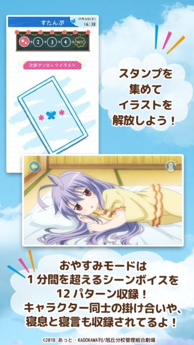 のんのんびよりアラームではアラーム動作時にはキャラクターのイラストが表示されます。また、おやすみモードという30秒を越す、就寝前シチュエーションのボイスを楽しめるモードも用意されています。