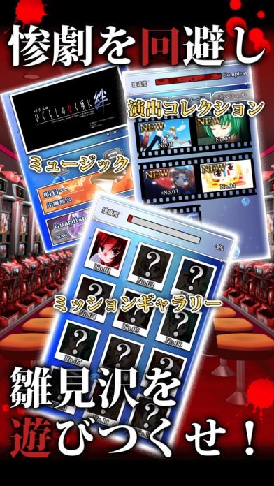 「パチスロ ひぐらしのなく頃に絆」は発症リンクシステムや惨劇回避型ARTなどの特徴的なゲーム性が人気のパチスロ実機アプリです。パチスロ実機の臨場感をそのまま味わえる「実戦モード」と効率的なシミュレーションがおこなえる「研究モード」が搭載されており、目的に合わせたプレイが楽しめます。アプリオリジナルのギャラリーモードや演出コレクションも搭載されています。