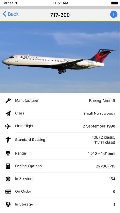 The information included for each aircraft is divided in a data section and a short description of the aircraft type. For each aircraft type, the AirApp presents the specifications that determine in which market segment the aircraft operates. As airlines place orders based on an aircraft’s range and payload, the AirApp displays for every aircraft the range, seat count and cargo load (for freighters) as provided by the manufacturers’ marketing material. The AirApp also presents information about the first flight date indicating the age of technology applied in the aircraft, and the engine choices available. Besides the aircraft specifications, the AirApp introduces market information such as the amount of aircraft in service, on order, stored and the number of operators. In case the aircraft is no longer in production, the last delivery date is also mentioned.
