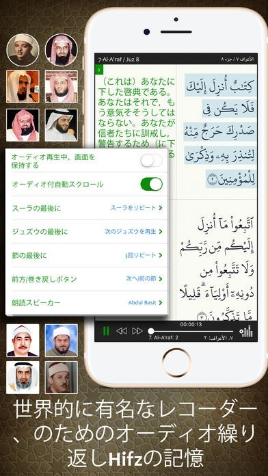 - 高度なオーディオは、暗記(アーヤの繰り返し、スーラ、数々の繰り返し、間隔、朗読スピード)を助ける機能を持ちます。