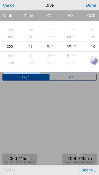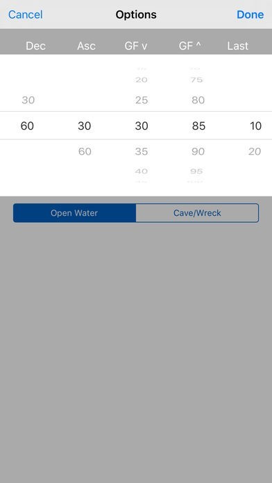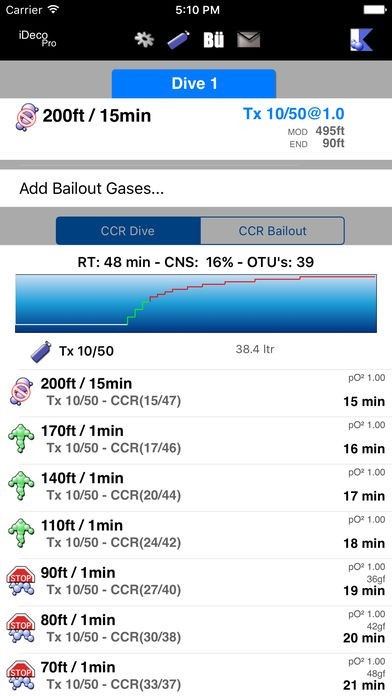 Closed Circuit (CCR): Supports any O2/He/N2 combination for diluent. Automatically generates bailout plans based on entry of bailout gases. Features a Cave/Wreck bailout option for overhead environment bailouts and gas planning.