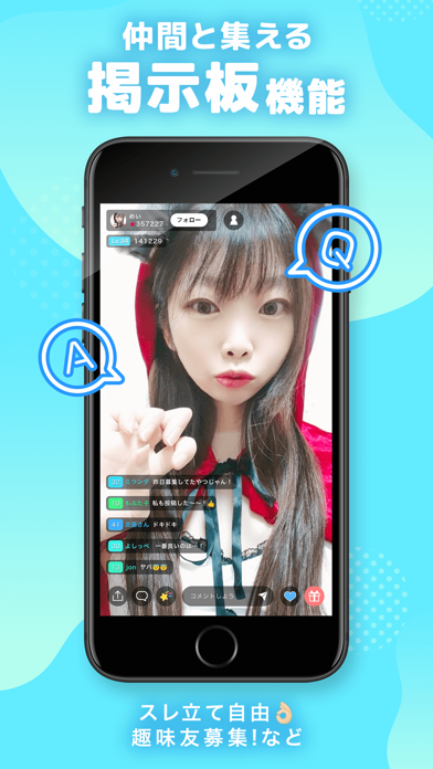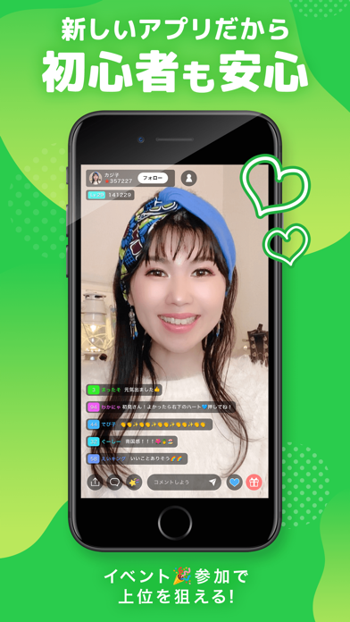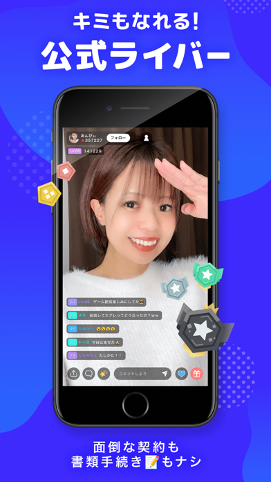 一切のアダルト行為を禁止し、男女どなたでもLIVE配信ができ、リスナーとなり、1人のライバーに複数のリスナーがコメントで応援できる健全なアプリです。