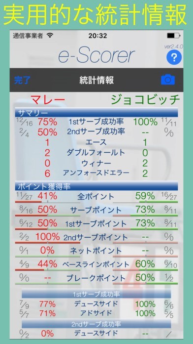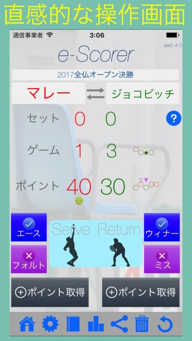 「イースコアラー テニス」は、簡単な操作でテニスのスコアをiPhoneに保存することができるアプリです。どちらがポイントを取得したかは、ボタンを一度タップするだけで行えます。また、サーブの成功率や、レシーブのコースなどプレイヤーの特性を把握するために有益な情報が満載です。テレビでトッププレイヤーの試合を楽しんでいる方にも使いやすいデザインとなっています。