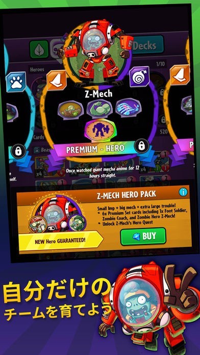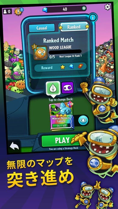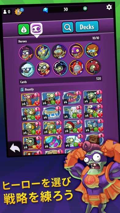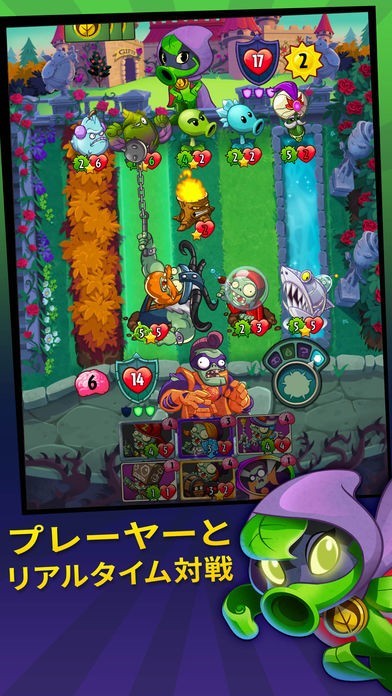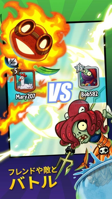 プラント側、ゾンビ側と二つに分かれたチームのさまざまなヒーローたちをゲットして自分だけのオリジナルユニットを結成した楽しめるカードバトルゲーム「プラント vs. ゾンビ ヒーローズ Plants vs. Zombies™ Heroes」!カードの種類は何百種類も用意されているので、組み合わせの数は千差万別!ほかのユーザーとはリアルタイムマッチで対戦することができるので自分の実力を確かめたり、キャラクターを自慢しよう!
