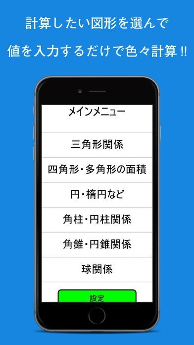 正三角形や直角二等辺三角形、四角形、多角形など34種類の図形と76パターンの計算を搭載に対応しているために34種類もの図形を公式も気にせず計算することが可能になっています。