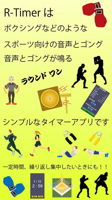 「R-Timerでスマホがラウンドタイマーに!」には、ボクシングなどで利用されるゴングが使われています。開始と終了の合図が非常にわかりやすいので、様々な場面で応用することが可能です。
