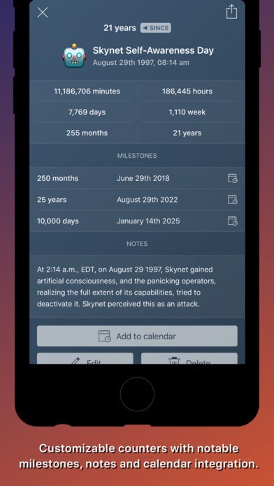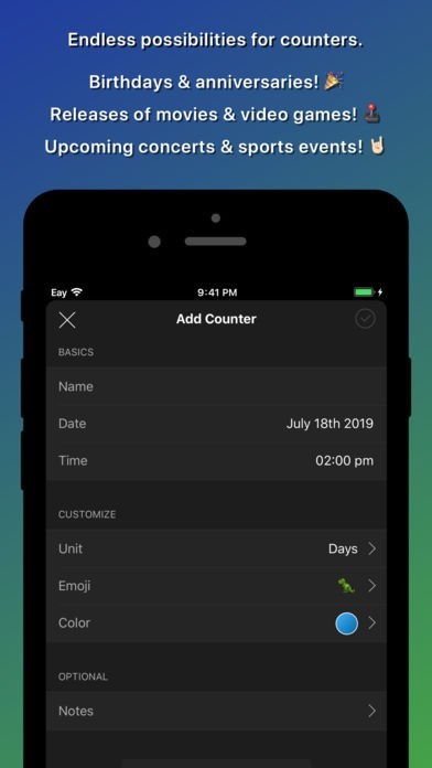 - Notes: Need to remember more than just a date? No problem, just add a custom note to your counter.