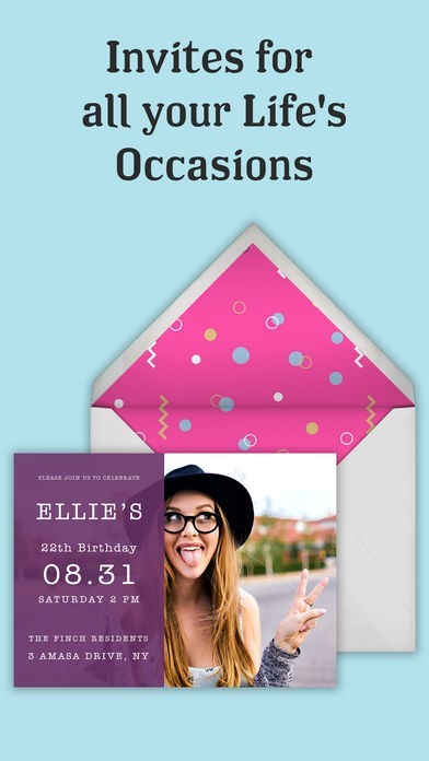 App Storeより引用Invitation Maker allows you to send custom online invitations directly to your friend's mailbox or through social media.