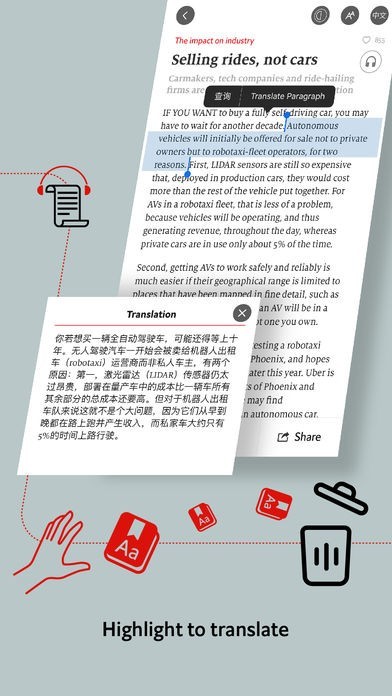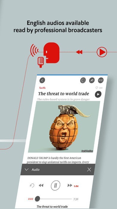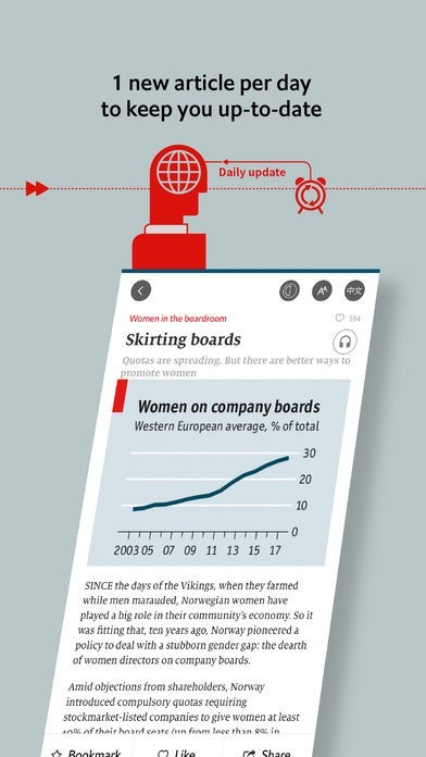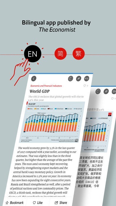平日は経済学者のレビュー記事、毎月10本以上の世界経済、財務、技術に関する週刊誌記事を無料で読むことができます。言語は英語または中国語を選択するので、それぞれの言語の学習にも役立ちます。