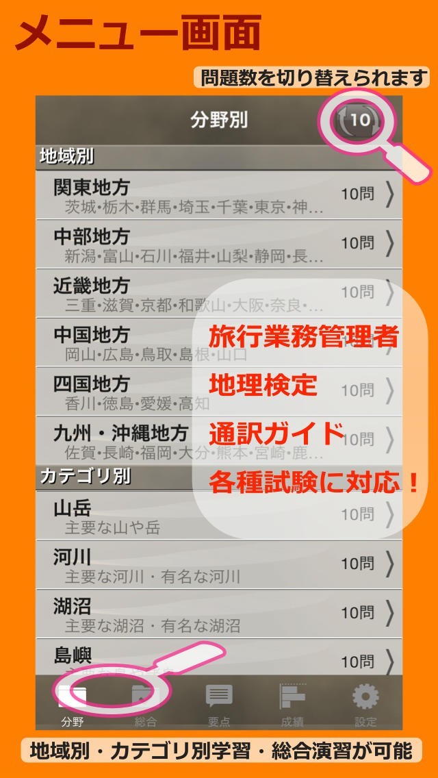 カテゴリ別:「温泉」「寺社仏閣」「名産品」など各カテゴリ別に問題を解く事が可能なので、不得意分野を優先的に学習できます。