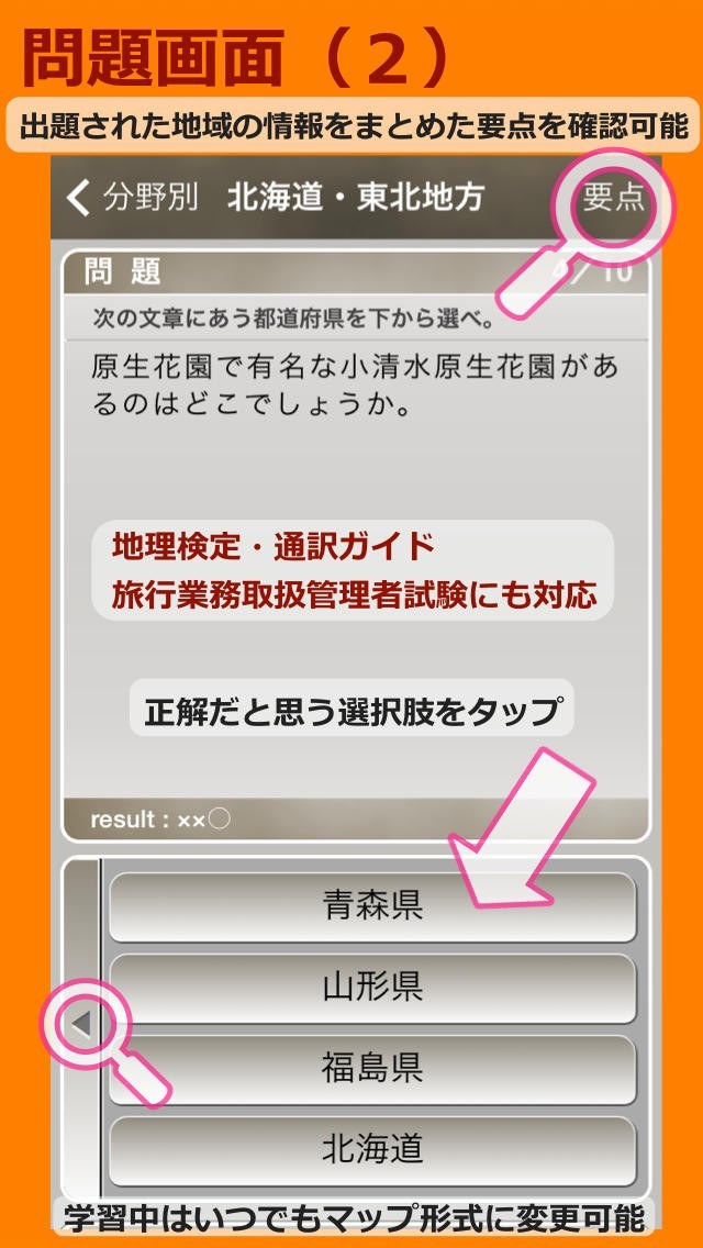 それぞれの問題に日本地図から該当する県を選ぶ形式、4つの県名から正しい答えを選ぶ形式があります。通訳ガイド試験や旅行業務試験にも柔軟に対応可能です。