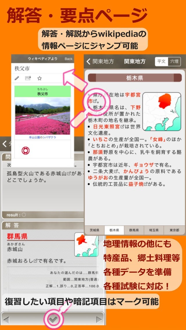 App Storeより引用各種試験対応!社会人のための日本地理は、四択問題・地図問題・解説・資料を通じて日本地理を総合的に学習するためのアプリです。資格・試験対策のみならず、ビジネスマンのコミュニケーションツール、雑学・教養を深めたい方の読みものとしても利用可能です。
