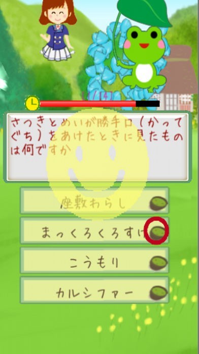 そのキャラやストーリーなどのクイズを、このアプリのキャラであるカエルが出題します。