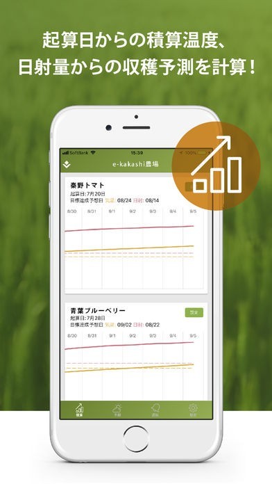 「e-kakashi Ai (アイ)」は、農作業の判断をサポートする栽培ナビゲーションアプリです。 農業用高精度気象予報をベースに、1キロメートル四方の広さを気象予測可能。 設定した農場の気象情報をピンポイントで取得できるのが特徴です。 気象予測機能では降水量や風向き、日射などの詳細予測も行える他、簡易な収穫日予測機能も備えています。