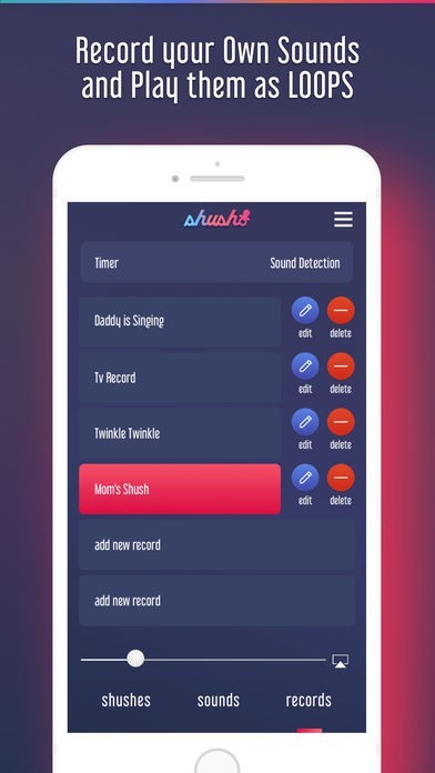 • Select a shush, sound loop or a recording and it will play as long as you like