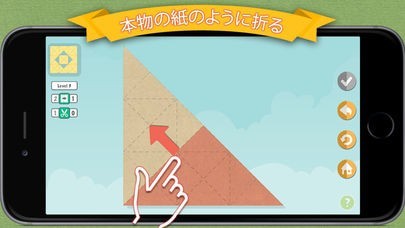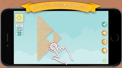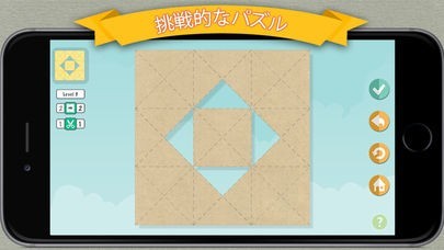 「Fold & Cut」では、画面の隅に目標とする図形が表示されます。折る回数と切る回数はあらかじめ決められているので、プレイヤーは考えながら紙を切り折りして図形を完成させなければなりません。