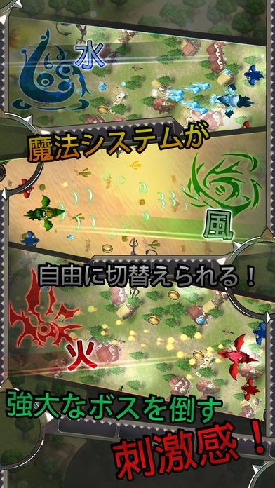 力押しのシューティングだけでなく、魔法システムの相性を使う戦略性も楽しむことができます。水、風、火とそれぞれスピードや威力の違う魔法を相手によって使い分けて、手強いボスを倒しましょう。