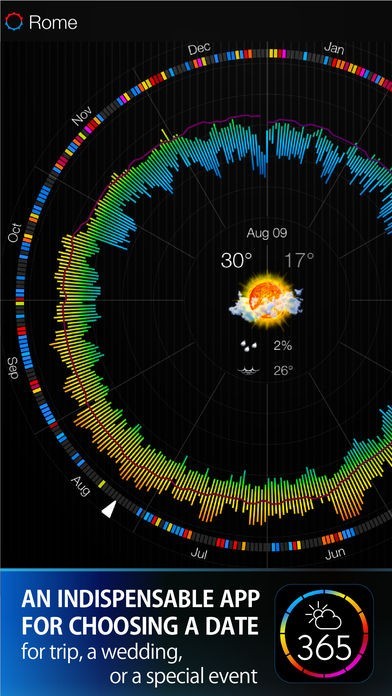 Weather 365 days provides instant access to archive of global historical weather, climate data and sea-surface temperatures. Using original visualization the app provides all important weather-data at a glance - sun, clouds, rain, snow, local weather extremes and records, holiday weather, day/night temperatures, sky conditions, probability of precipitations and temperature of water.