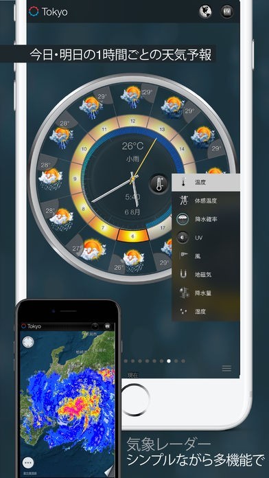 気温・湿度・降雨量に加え、気圧や体感気温なども表示されませすが、他のアプリに加え、どれも精度が高いのが一番の特徴となっています。国内・海外問わず、長期旅行の予定がある際には、非常に信用できるアプリになっています。
