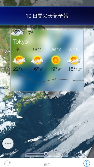 アニメーション形式で雲の画像が確認出来るので、天候の変化も確認しやすいです。台風経路図の表示に対応しているので、災害予防にも役立っています